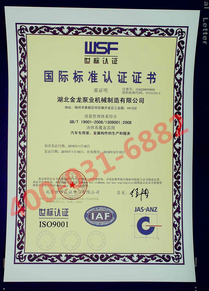 在公司員工的不懈努力下,經過認證公司專家的全面、嚴格、細致的指導和審核,確認我公司質量管理體系符合ISO9001:2008質量體系標準的要求,并于2012年10月22日,向我公司正式頒發了ISO9001質量管理體系認證證書。